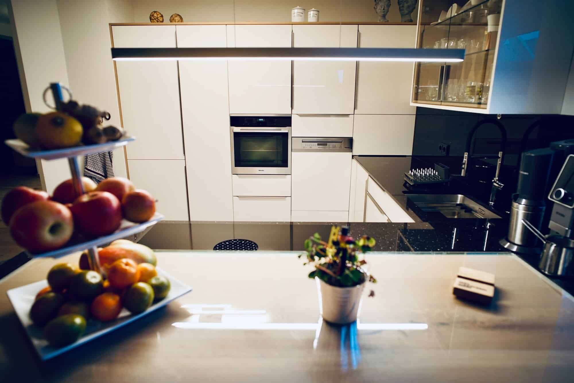 Durchdacht bis ins kleinste Detail, bietet die Küche eine perfekte Symbiose aus Design und Ergonomie: Backofen und Geschirrspüler sind in bequemer Bedienhöhe integriert, während das BORA PUXU Flächeninduktions-Kochfeld mit Muldenabzug für ein freies Sichtfeld sorgt. Ein intelligentes Lichtdesign, steuerbar per App, setzt mit dezenter Ambientebeleuchtung und funktionalem Arbeitslicht unter den Hängeschränken die passenden Akzente für jede Situation.