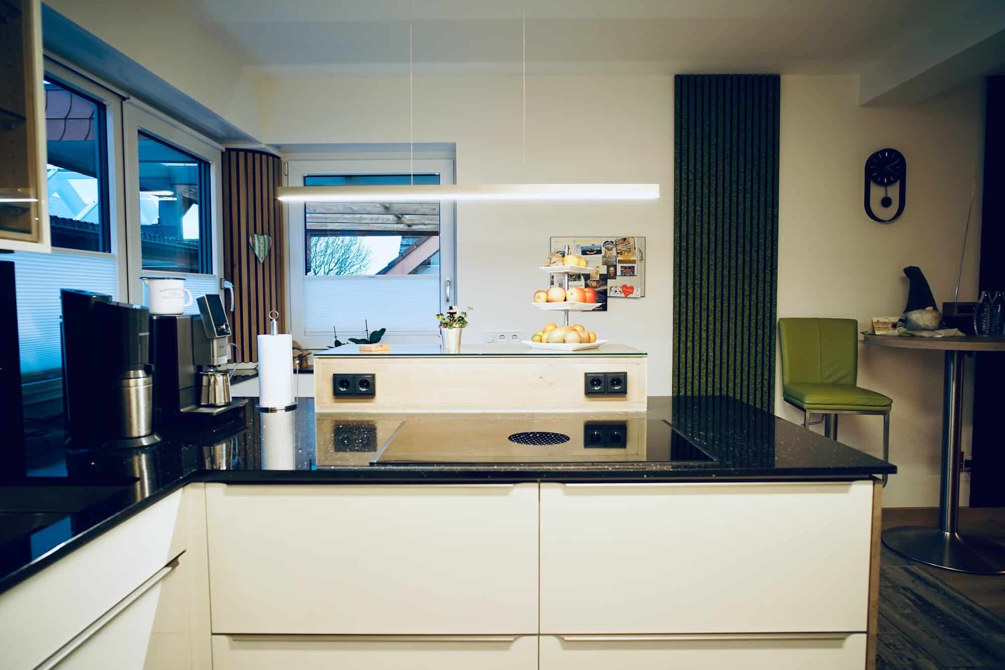 Diese exklusive Küche im Einfamilienhaus besticht durch das harmonische Zusammenspiel von modernen Hochglanz-Fronten (RAL 9016) und warmen Akzenten aus massiver Eiche. Ein besonderes Highlight ist das handgefertigte Thekenboard mit klassischen Holzverbindungen wie Schwalben und Zinken, das den handwerklichen Charakter der Schreinerei Maul unterstreicht. Die 20 mm starke Arbeitsplatte sowie die Rückwand aus poliertem Granit „Silber Galaxy-Stargate“ verleihen dem Raum eine edle Tiefe.