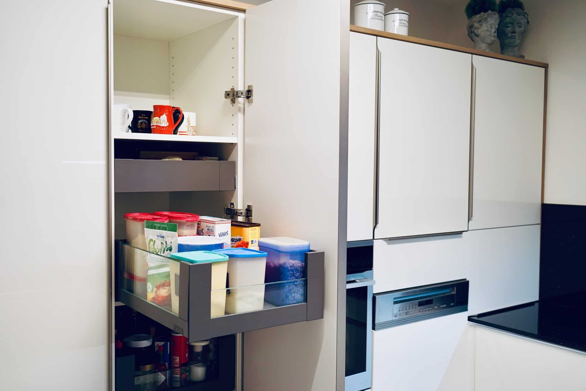 - Stauraum-Spezialisten: Der „Space Tower“ Vorratsschrank mit einzeln zu öffnenden Auszügen und der „Le Mans“ Eckschrank-Schwenkauszug nutzen jeden Winkel optimal aus.