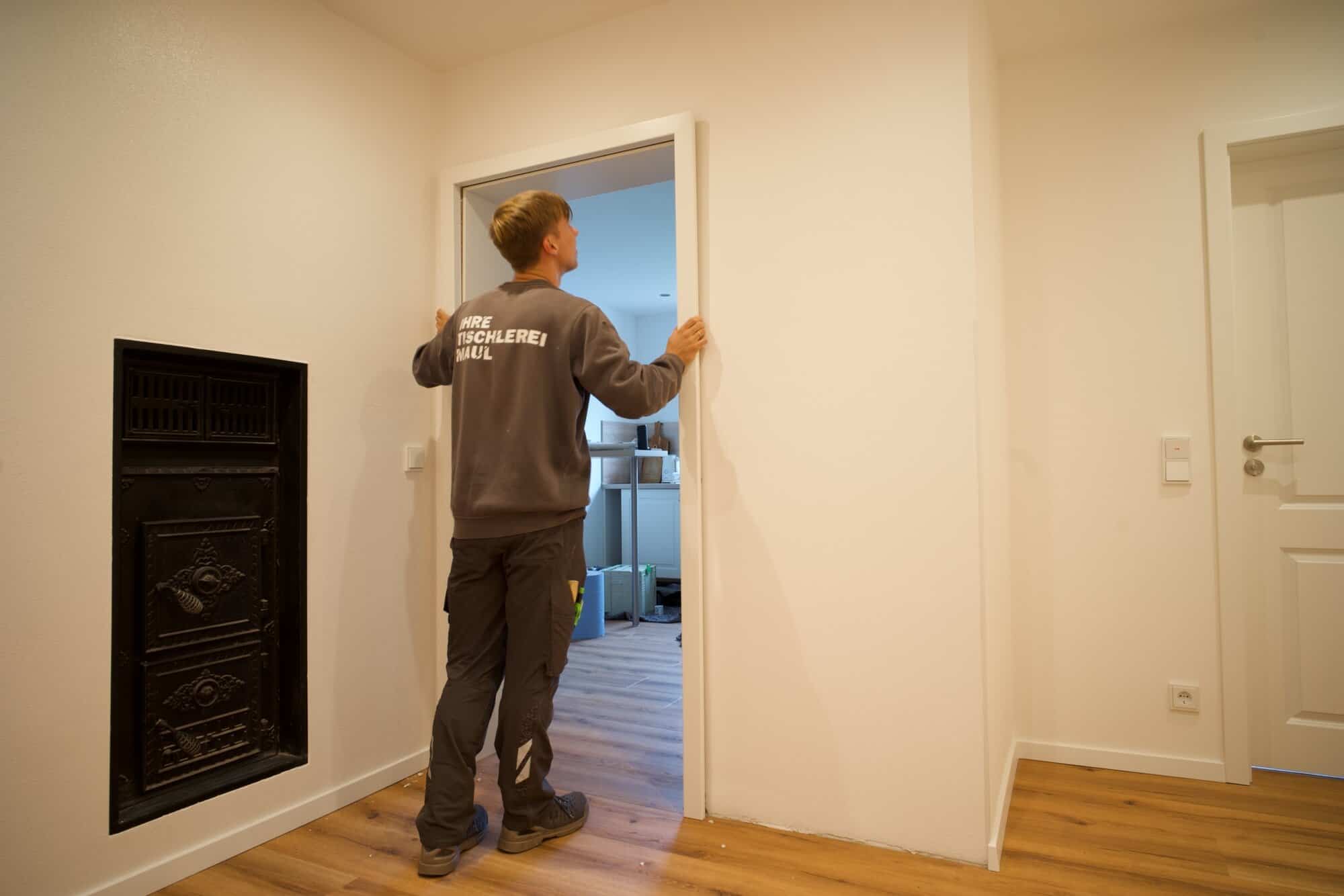 Wir montierten die Türelemente fachmännisch mit 2-K-Zargenschaum. Das fachgerechte Ausrichten der Türen und die Justierung aller Beschläge für leisen, sauberen Türlauf ist für uns selbstverständlich.